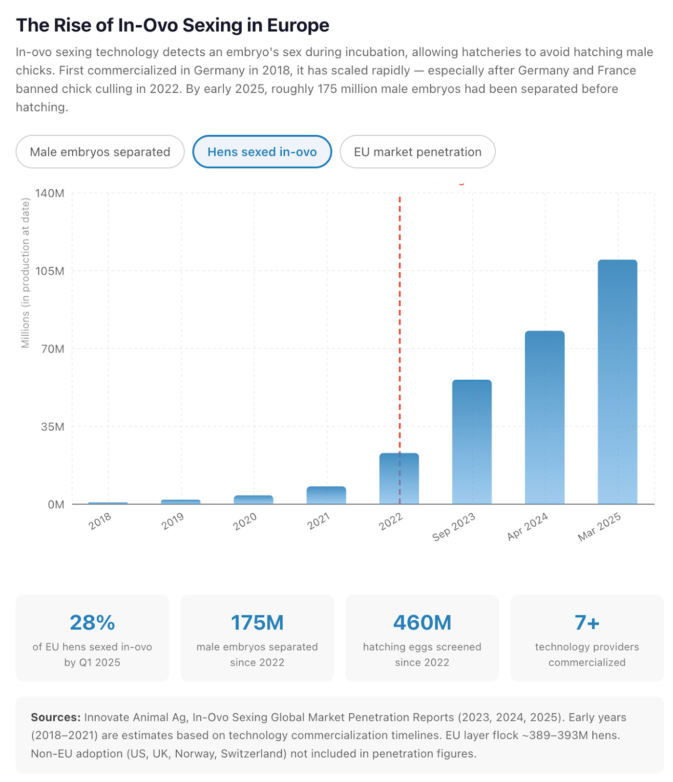 In-ovo sexing is the poster child of this approach. Decades of advocacy against killing male chicks had gained little traction because producers saw no viable alternative. Then innovators developed technologies that detect an embryo’s sex early in incubation, allowing hatcheries to avoid hatching male chicks altogether. Governments in France, Germany, the US, and Japan — along with philanthropies, including ours — funded work to bring down costs. That made it possible for half a dozen European countries to phase out chick killing, progress that has already spared over 175 million chicks from being born and killed.