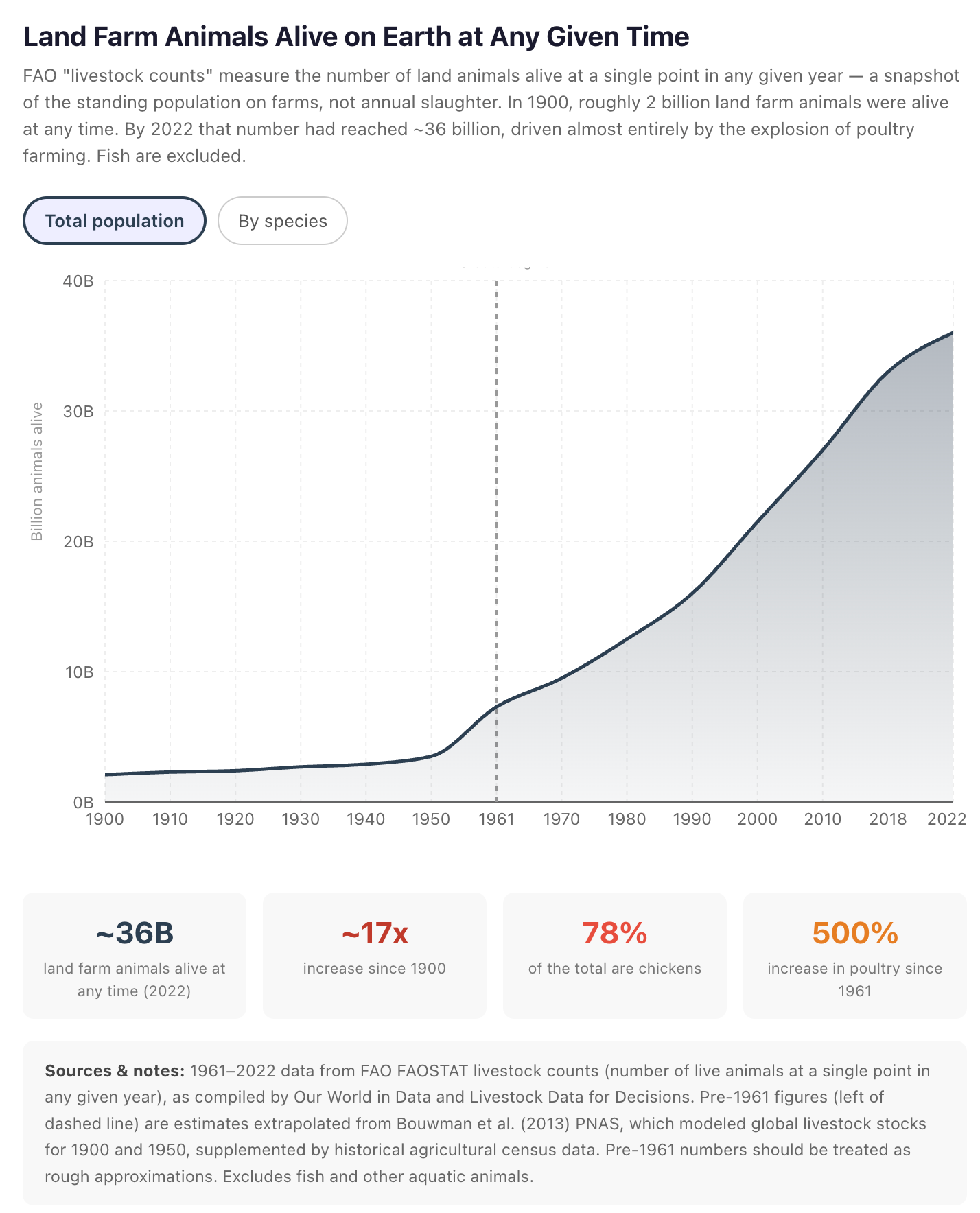 But this humane progress was quickly undone by further technological progress. New antibiotics, vaccines, and synthesized vitamins let farmers keep vast numbers of animals alive in wretched conditions, severing the historic link between good treatment and productivity. Rising prosperity spiked demand for meat, spurring the growth of factory farms from the 1950s on.