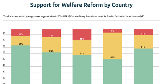 Most people agree that farmed animals deserve better legal protections: 84% of Europeans, 61-80% of Americans, 70% of Brazilians, 51-66% of Chinese, and 52% of Indians agree with some version of that statement. Yet almost all farmed animals globally still lack even the most basic protections.